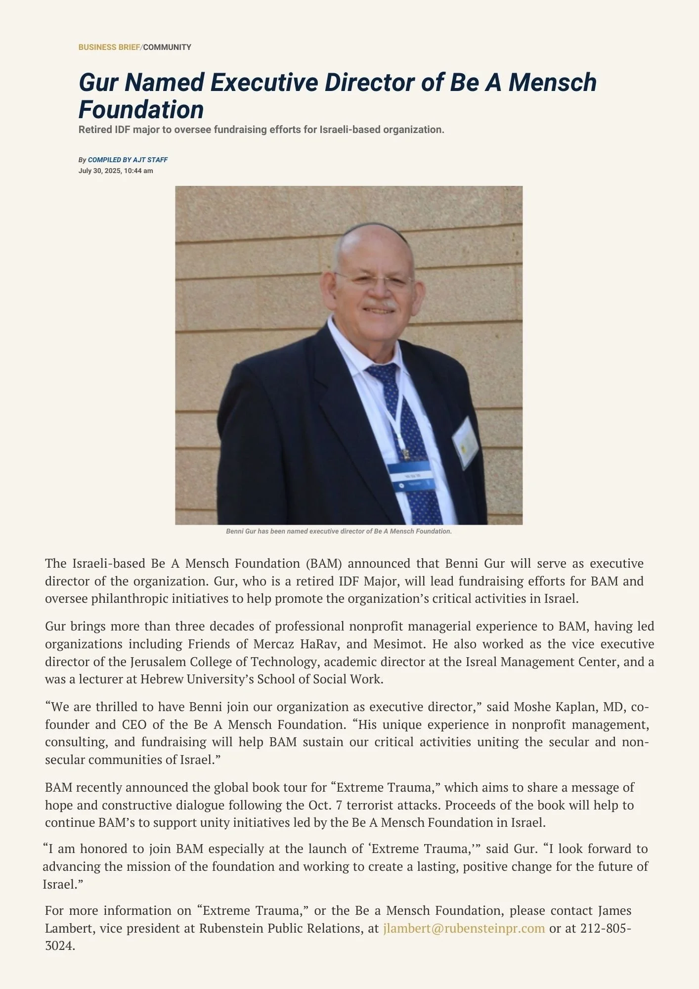 Media 5 Towns Jewish Times Extreme Trauma: When Evil Struck, Human Greatness Answered i24 NEWS Interview with Gabriel Sanders, BAM Foundation Spokesman The Algemeiner Looking For a Few Good Mensches: Israeli NGO Seeks to Inspire Jewish College Students in US to Confront, Transcend Rising Antisemitism The Jerusalem Post Be A Mensch Foundation: Advancing dialogue between secular, haredi Israelis